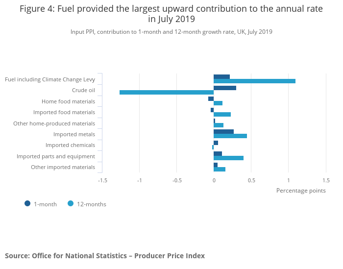 On the month, crude oil provided the largest positive contribution of 0.30 percentage points with monthly growth of 1.8%. This is a 9.3 percentage points increase following negative growth of 7.5% in June 2019.