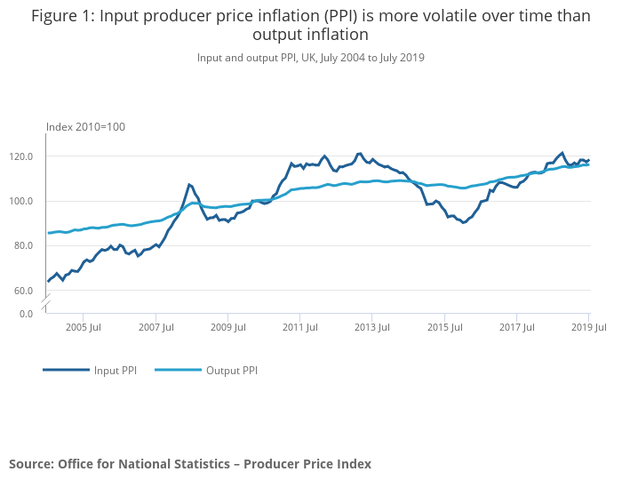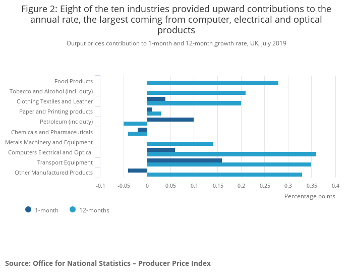 The headline rate of output inflation for goods leaving the factory gate was 1.8% on the year to July 2019, up from 1.6% in June 2019.