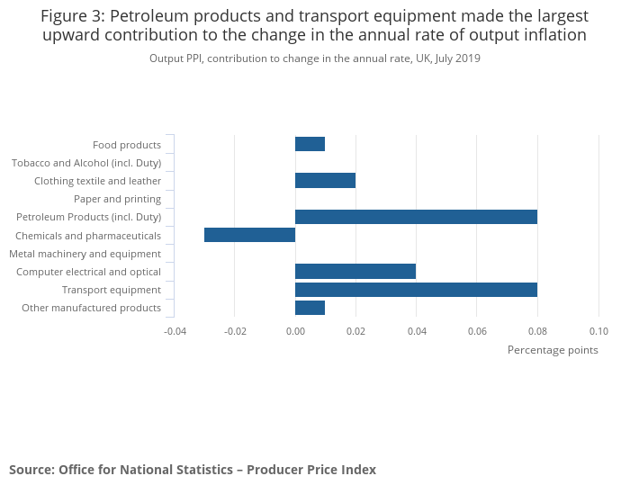 Transport equipment provided the largest upward contribution to the monthly rate of output inflation, at 0.16 percentage points. Prices for this product group rose by 1.2% on the month in July 2019 which is the highest the rate has been since July 2016.
