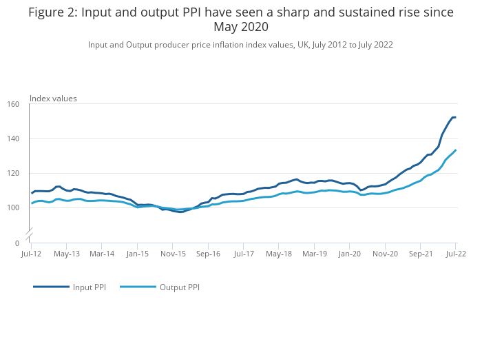 Input and Output producer price inflation index values, UK, July 2012 to July 2022