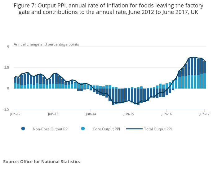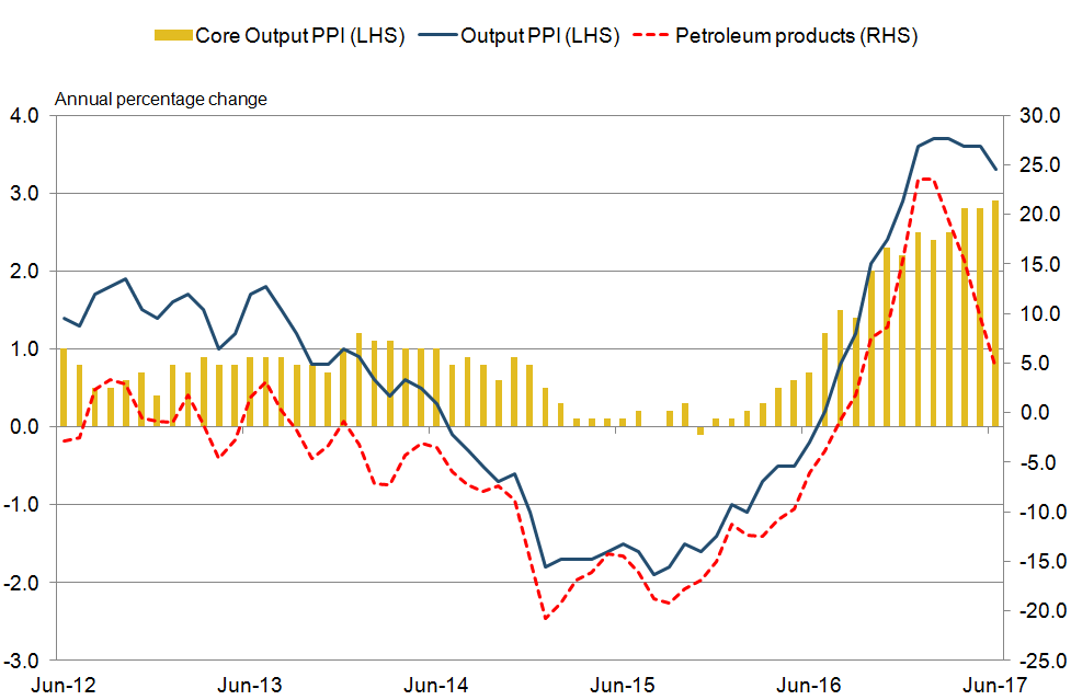 Core output inflation rose 2.9% on the year to June 2017 from 2.8% in May 2017 and is now the largest contributor to the annual rate of inflation for goods leaving the factory gate.