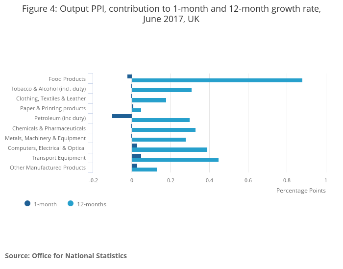 Figure 4: Output PPI, contribution to 1-month and 12-month growth rate, June 2017, UK