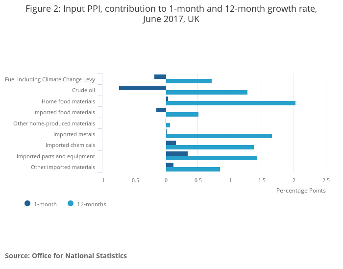 Figure 2: Input PPI, contribution to 1-month and 12-month growth rate, June 2017, UK