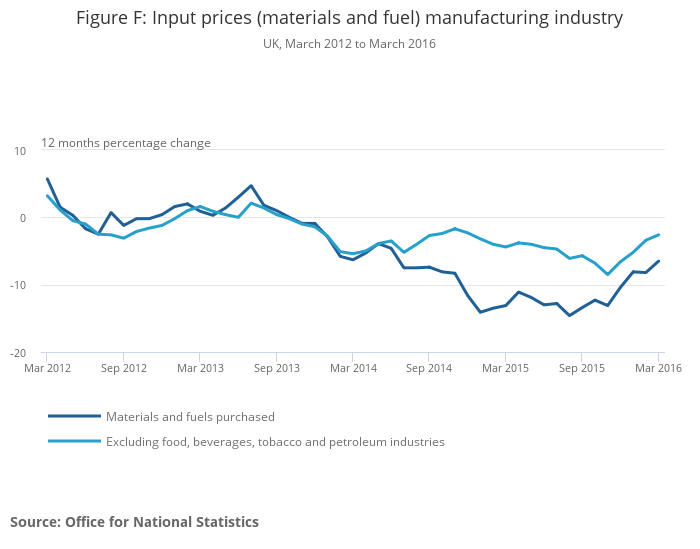 The overall input index for all manufacturing, which measures changes in the price of materials and fuels purchased by manufacturers, fell 6.5% in the year to March 2016, compared with a fall of 8.2% in the year to February 2016. The main downward contributions to the index came from crude oil with smaller, but notable, downward contributions from fuel (incl. climate change levy) and imported metals.