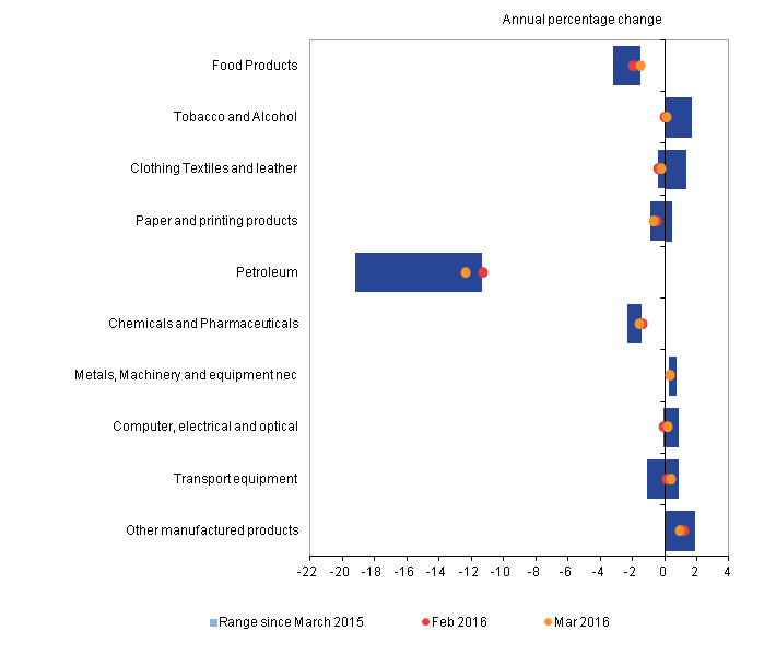 Factory gate prices fell 0.9% in the year to March 2016, compared with a decrease of 1.1% in the year to February 2016. This index has now seen negative movements on the year for 21 consecutive months. The main contribution to the annual rate for March 2016 came from petroleum products. A fall in the price of food products also contributed towards the fall in the output price of manufactured products (Figure B).