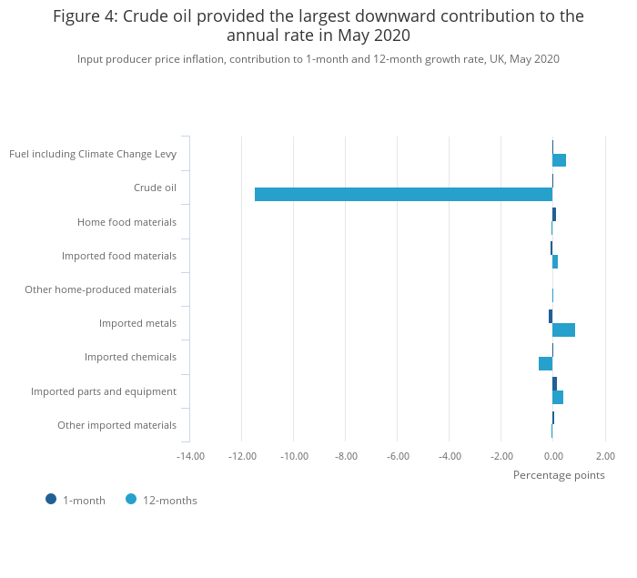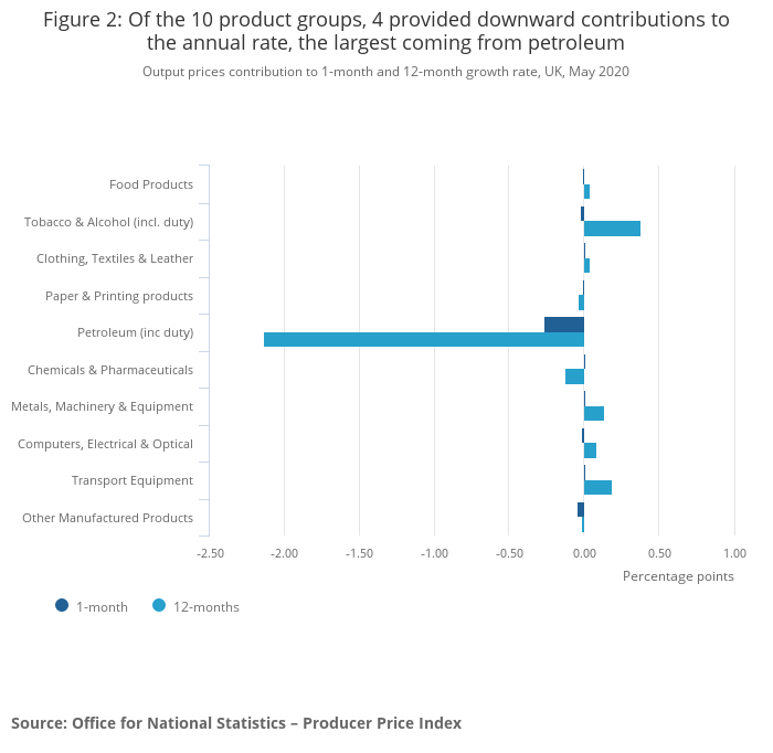Petroleum provided the largest downward contribution of 2.13 percentage points to the annual rate (Figure 2) and had negative annual price growth of 26.8% on the year to May 2020 (Table 2). This is the lowest the annual rate has been since Producer Price Index (PPI) records began in January 1996, and it was driven by diesel and gas oil, which also had a record annual fall of 24.5%. Price movements for petroleum products in May 2020 continued the trend seen in recent months and likely reflected both demand and supply side factors during the ongoing coronavirus (COVID-19) pandemic. These include large falls in crude oil prices in March and April 2020, which take time to feed through the manufacturing sector, as well as reduced demand for petroleum products, particularly for transport, because of the lockdown measures.