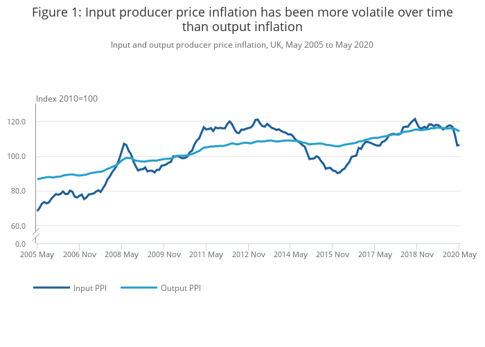 The headline rate of output inflation for goods leaving the factory gate was negative 1.4% on the year to May 2020, down from a negative 0.7% in April 2020.