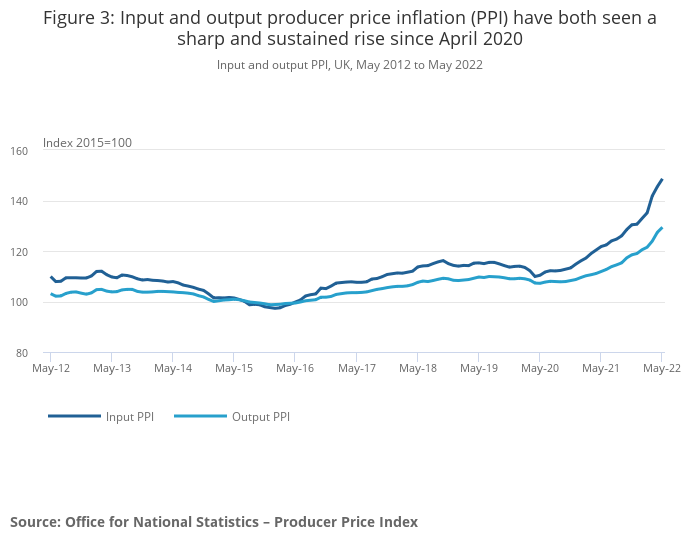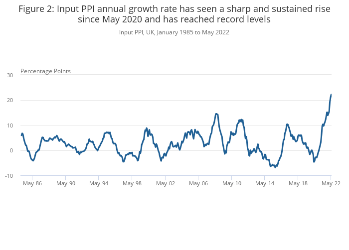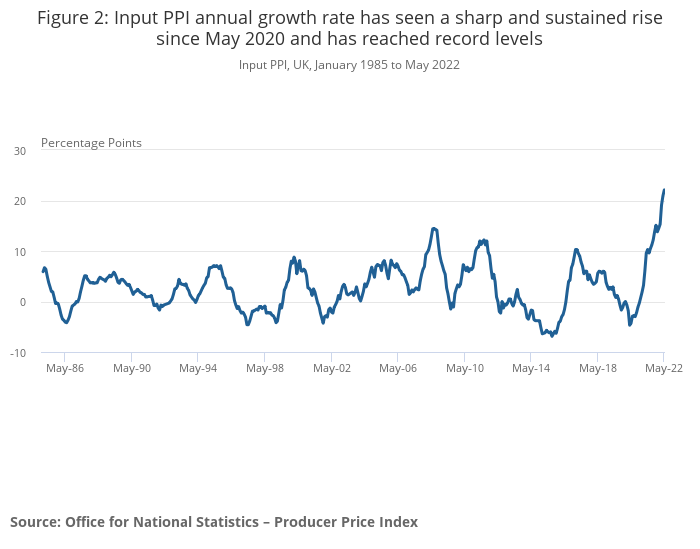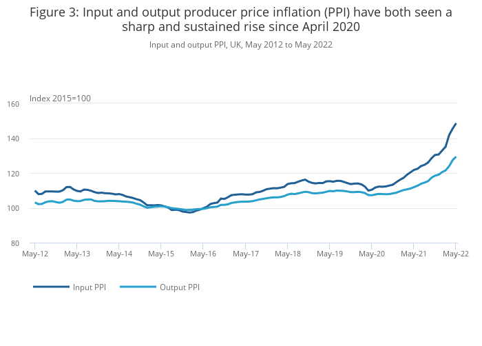Producer input prices rose by 22.1% in the year to May 2022, up from 20.9% in the year to April 2022; this is the highest the rate has been since records began in January 1985.