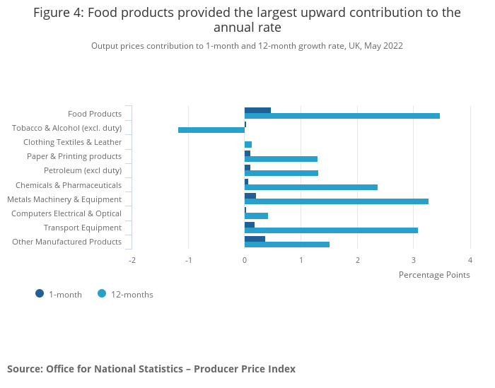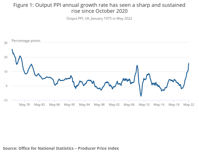 Producer output (factory gate) prices rose by 15.7% in the year to May 2022, up from 14.7% in the year to April 2022.