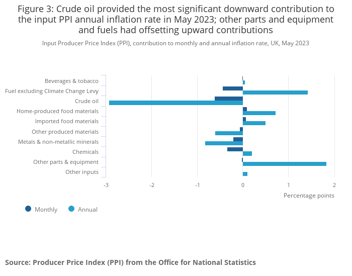 Input Producer Price Index (PPI), contribution to change in the annual inflation rate, UK, May 2023
