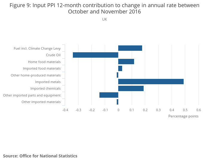 Although weakness in sterling continues to put upward pressure on most imported Producer Price Index (PPI ) components, this eased somewhat during November. However, costs continued to increase for UK manufacturers buying imported metals. This component was the second largest contributor to growth in input producer prices at 2.4 percentage points of the total.