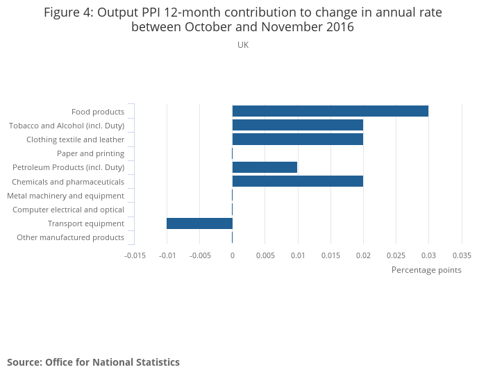 In November 2016 the largest contribution to output PPI growth came from refined petroleum products which contributed 0.6 percentage points to the 2.3% annual growth. This is a slight increase from the 0.5 percentage point contribution in the year to October 2016, which reflects the rising pressure from the crude oil input PPI component.