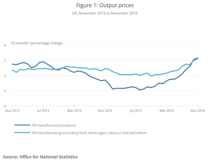 Factory gate prices (output prices) for goods produced by UK manufacturers rose 2.3% in the year to November 2016, compared with an increase of 2.1% in the year to October 2016.