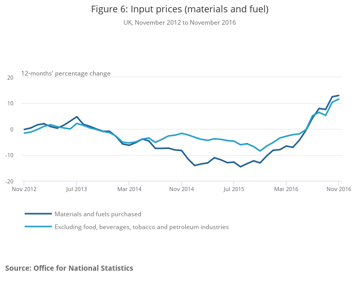 The overall price of materials and fuels bought by UK manufacturers for processing (total input prices) rose 12.9% in the year to November 2016, compared with a rise of 12.4% in the year to October 2016. Between October and November, total input prices fell by 1.1%, compared with a record increase of 4.5% the previous month.