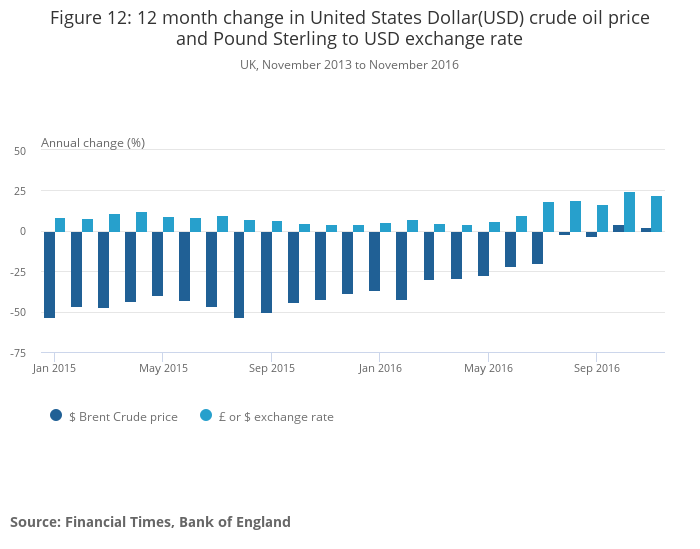 Figure 12: 12 month change in United States Dollar(USD) crude oil price and Pound Sterling to USD exchange rate
