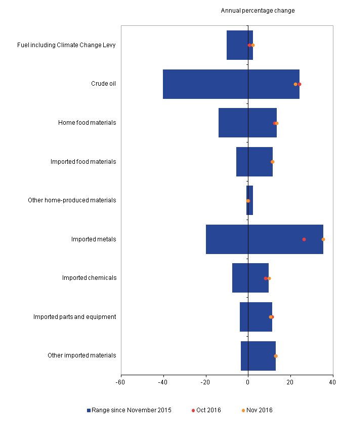The overall input index for all manufacturing, which measures changes in the price of materials and fuels purchased by manufacturers, rose 12.9% in the year to November 2016, compared with a rise of 12.4% in the year to October 2016. The main upwards contributions to the index came from crude oil, imported metals, and imported parts and equipment.