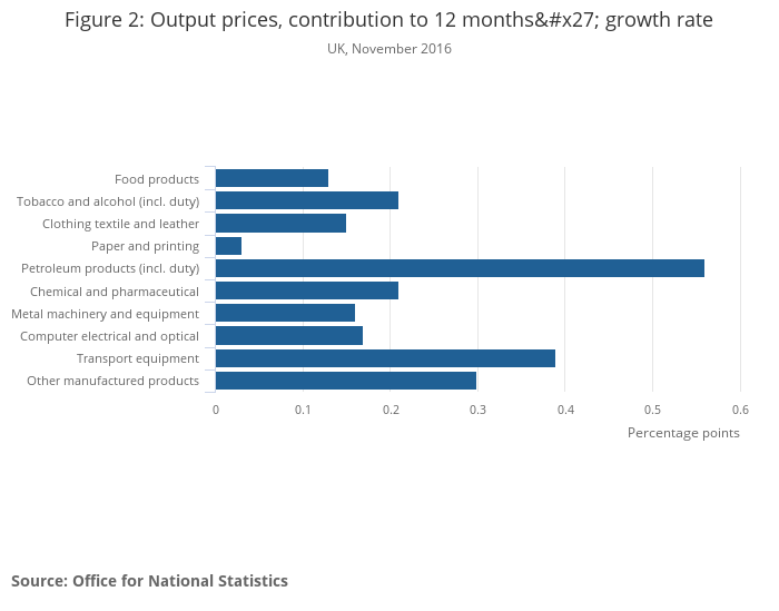 Factory gate prices (output prices) for goods produced by UK manufacturers rose 2.3% in the year to November 2016, compared with an increase of 2.1% in the year to October 2016.