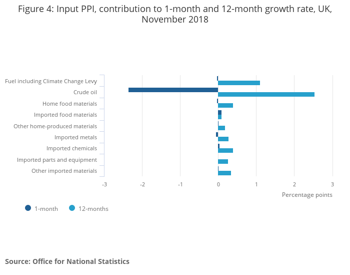 Figure 4: Input PPI, contribution to 1-month and 12-month growth rate, UK, November 2018