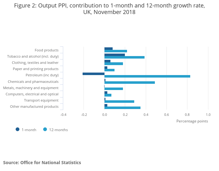 Petroleum was the only product group with a downward contribution to the monthly rate (0.21 percentage points), with the one-month rate falling from 2.2% in October 2018 to a negative 1.8% in November 2018.
