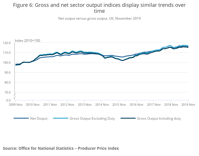 Producer price indices (PPIs) are measured on two different bases: gross and net of inter-sector sales. Gross sector PPIs include products sold by one business to another business classified to the same industry sector. Net sector PPIs exclude (net out) products sold by a business to another business classified to the same industry sector. The Office for National Statistics (ONS) currently headlines with net sector PPIs, which include duty. We will move our headline to a gross sector basis excluding duty early in 2020, in line with international best practice.