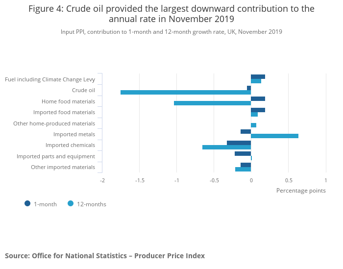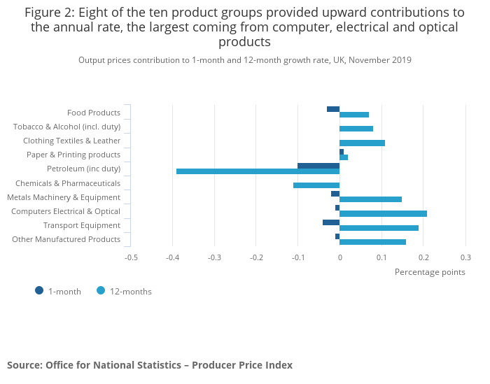 The headline rate of output inflation for goods leaving the factory gate was 0.5% on the year to November 2019, down from 0.8% in October 2019.