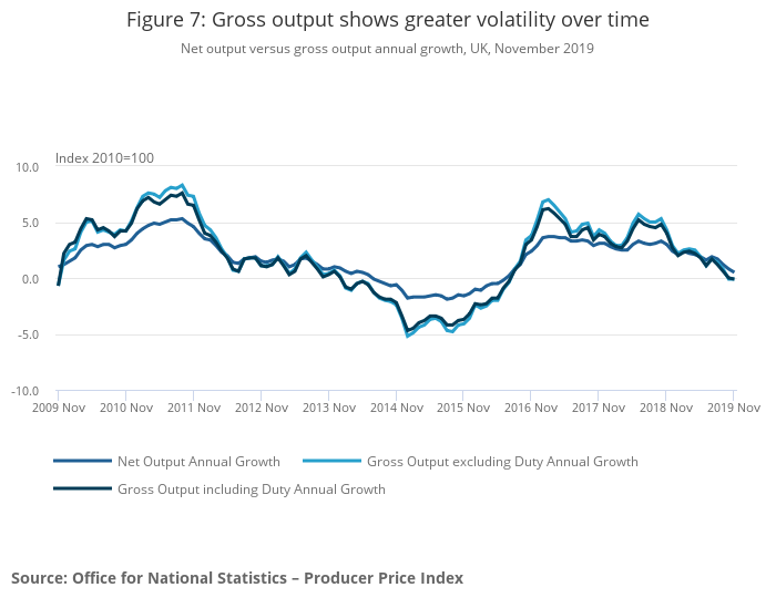 Image .csv .xlsAs shown in Figure 7, gross and net sector output indices display similar trends over time, although the gross indices show higher volatility, particularly at times of high inflation, either positive or negative. For net output PPI, the annual growth was 0.5% in November 2019, down from 0.8% in October 2019. For gross output excluding duty PPI, the annual growth in November 2019 was negative 0.1%, which is unchanged from October 2019.