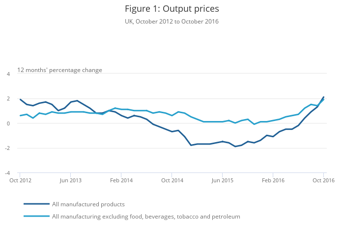 Factory gate prices (output prices) for goods produced by UK manufacturers rose 2.1% in the year to October 2016, compared with a rise of 1.3% in the year to September 2016.