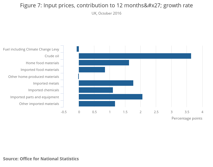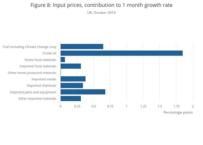 The overall input index for all manufacturing, which measures changes in the price of materials and fuels purchased by manufacturers, rose 12.2% in the year to October 2016, compared with a rise of 7.3% in the year to September 2016. The main upwards contributions to the index came from crude oil, other imported parts and equipment, and imported metals.