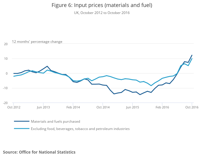 The overall price of materials and fuels bought by UK manufacturers for processing (total input prices) rose 12.2% in the year to October 2016, compared with a rise of 7.3% in the year to September 2016. Between September and October, total input prices rose by a record 4.6%, compared with an increase of 0.1% the previous month.