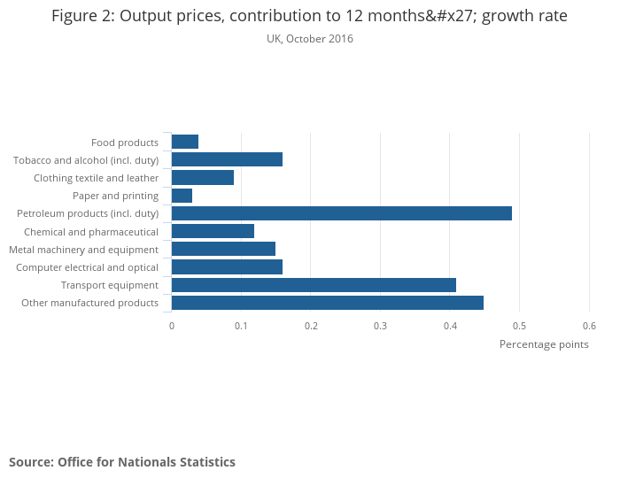 Output across the whole economy increased by 0.5% in Quarter 3 (July to Sept) 2016 compared with growth of 0.7% in Quarter 2 (Apr to June) 2016. Real output in the manufacturing sector increased by 0.4% in the year to Quarter 3 2016 compared with a 1.0% increase in Quarter 2 2016. Increased demand in the manufacturing sector may have made it easier for firms to pass on higher input costs to their customers.