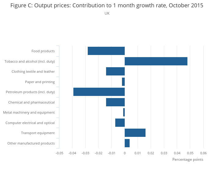 The monthly price index between September and October 2015 saw no movement (0.0%), compared with a fall of 0.1% between August and September 2015. The majority of product groups showed very small movements except for petroleum and food products, which provided the main downward contributions to the monthly rate, offset by a rise in tobacco and alcohol prices (Figure C).