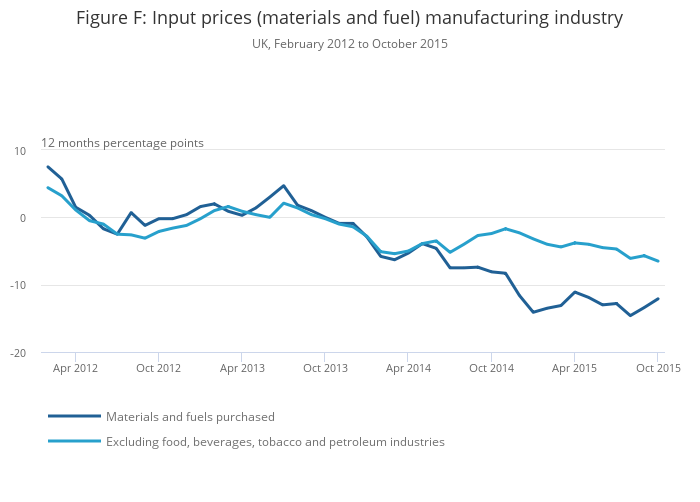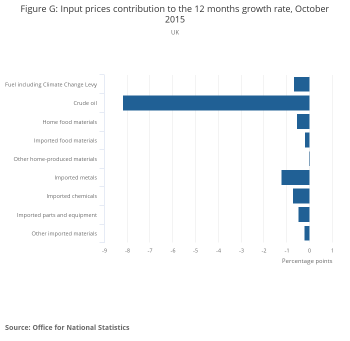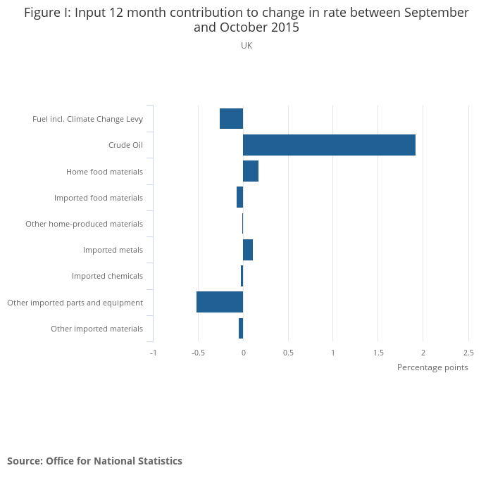 The overall input index for all manufacturing, which measures changes in the price of materials and fuels purchased by manufacturers, fell 12.1% in the year to October 2015, compared with a fall of 13.4% in the year to September 2015. The main downward contributions to the index came from crude oil with a much smaller, but notable, downward contribution from imported metals.