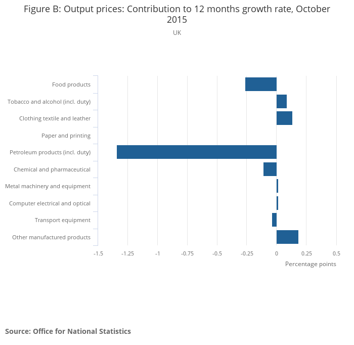 The price of goods bought and sold by UK manufacturers, as estimated by the producer price index, continued to fall in the year to October 2015. Crude oil continued to drive down input prices, feeding through to a drop in output prices of petroleum products