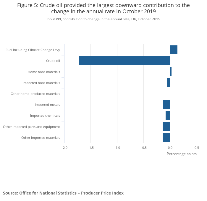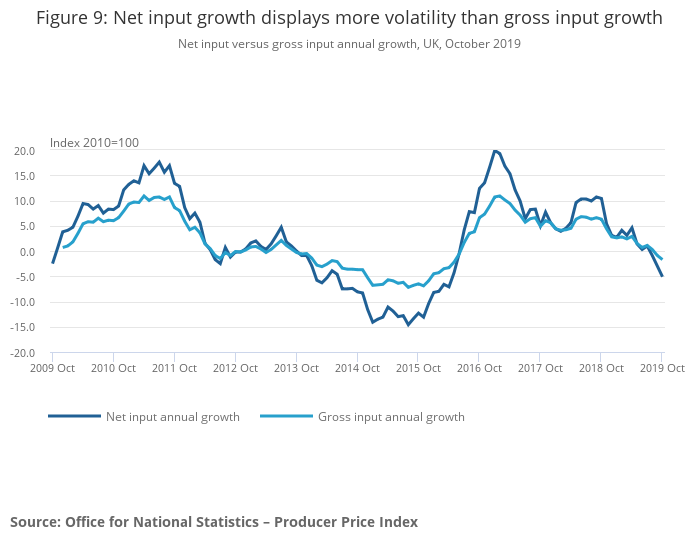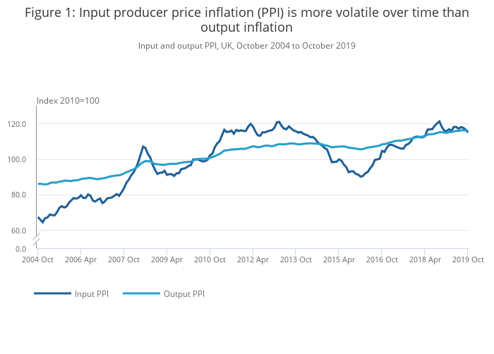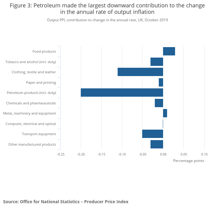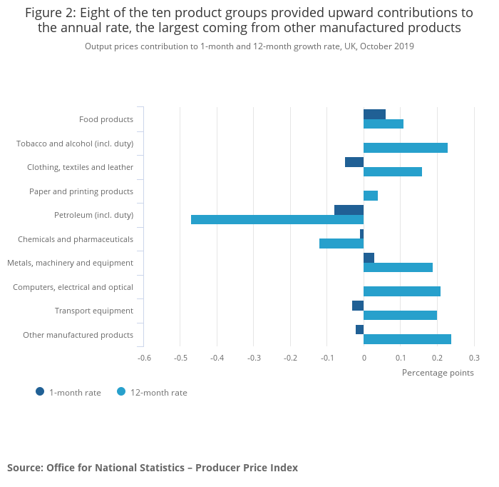 The headline rate of output inflation for goods leaving the factory gate was 0.8% on the year to October 2019, down from 1.2% in September 2019.