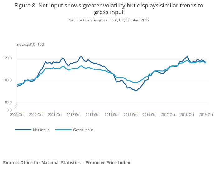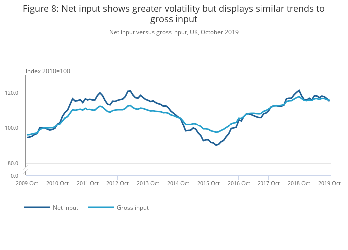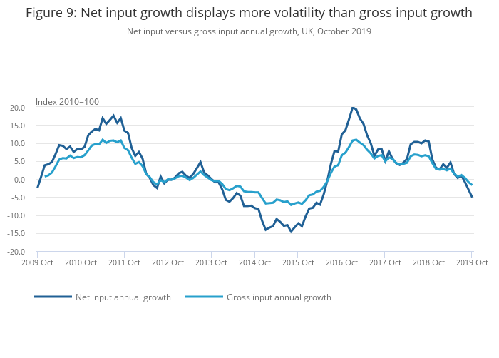 Image .csv .xlsAs shown in Figure 7, gross and net sector output indices display similar trends over time, although the gross indices show higher volatility, particularly at times of high inflation, either positive or negative. For net output PPI, the annual growth was 0.8% in October 2019, compared with 1.2% in September. For gross output excluding duty PPI, the annual growth in October 2019 was a flat 0.0%, while in September it was 0.8%.