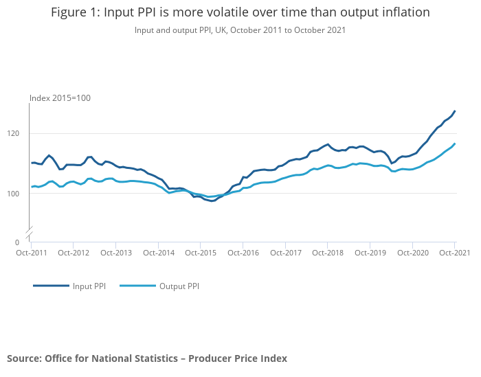 The headline rate of input prices showed positive growth of 13.0% on the year to October 2021, up from 11.9% in September 2021.