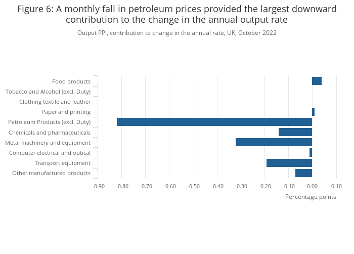 Of the 10 product groups, six show downward contributions to the change in the annual rate. Increases in the price of food products continue to push up output inflation but this is offset by petroleum prices, which provides the largest downward contribution to the change in the annual output rate, at 0.82 percentage points (Figure 6). Petroleum products saw a monthly decrease of 6.1% in price between September and October 2022, compared with an increase of 10.5% in the same period last year.