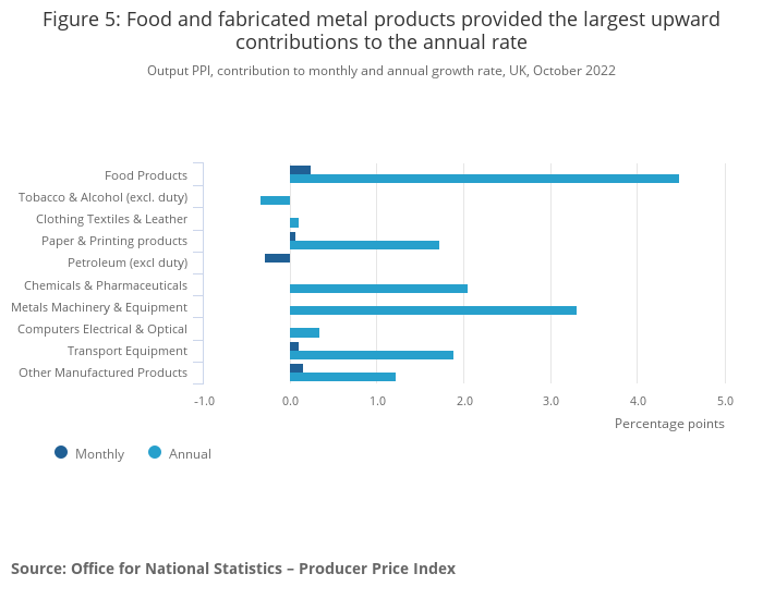 • Producer output (factory gate) prices rose by 14.8% in the year to October 2022, down from 16.3% in the year to September 2022.