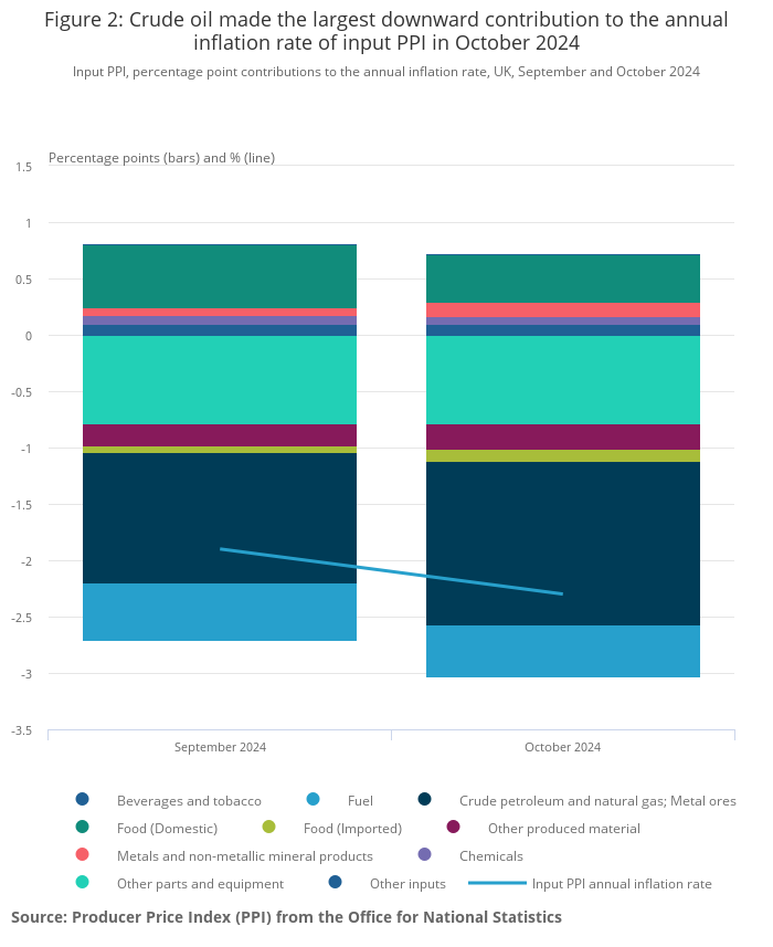 Input PPI, percentage point contributions to the annual inflation rate, UK, September and October 2024