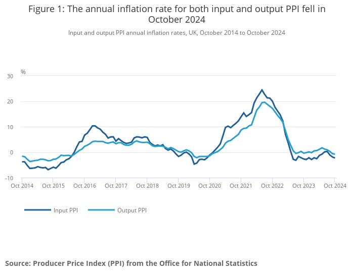 - Producer output (factory gate) prices fell by 0.8% in the year to October 2024, down from a revised fall of 0.6% in the year to September.