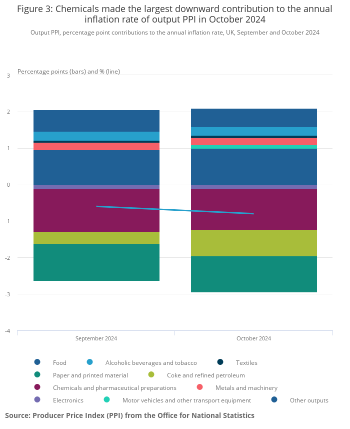 Download this chart Figure 3: Chemicals made the largest downward contribution to the annual inflation rate of output PPI in October 2024