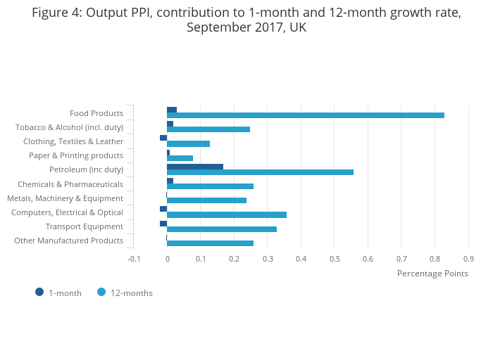 Figure 4: Output PPI, contribution to 1-month and 12-month growth rate, September 2017, UK