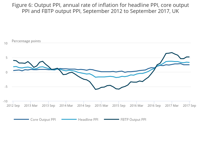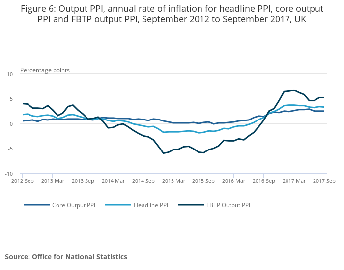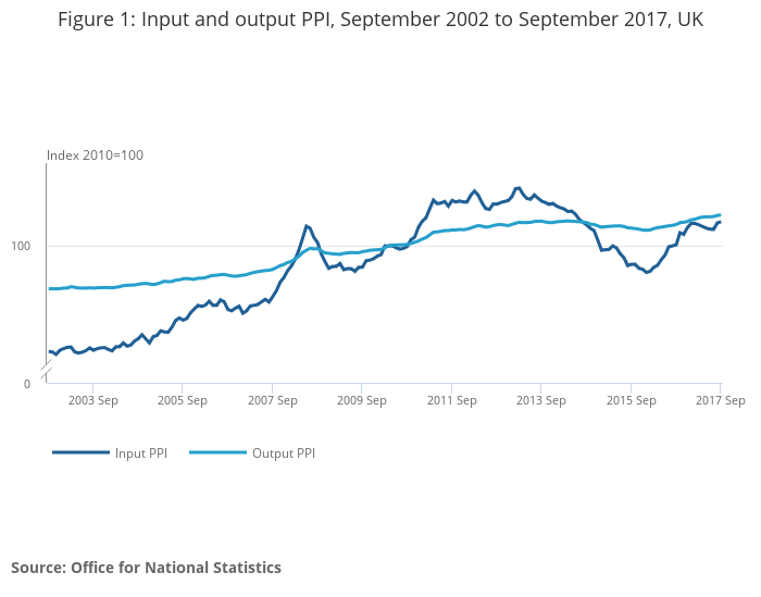 - The headline rate of inflation for goods leaving the factory gate (output prices) rose 3.3% on the year to September 2017, from 3.4% in August 2017.