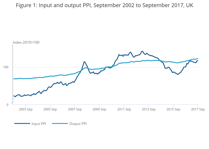 Figure 1: Input and output PPI, September 2002 to September 2017, UK