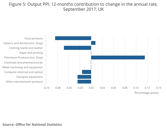 The two single largest contributions (by industry) to headline PPI in September 2017 came from food and petroleum products, contributing a combined 1.39 percentage points to the headline annual rate (Figure 4), which stood at 3.3% in September 2017 (Table 4). Tobacco and alcohol provided a further upward contribution of 0.25 percentage points to the rate (Figure 4), which means FBTP industries contributed a combined 1.64 percentage points to the output PPI headline growth rate.