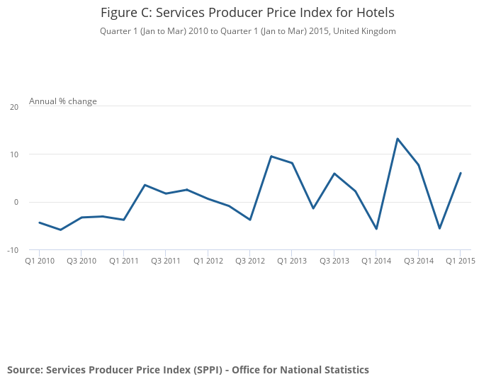 Accommodation and food services prices increased by 4.2% in the year to quarter 1 of 2015. This was mainly caused by a rise in the prices received by UK businesses for hotel services. Hotel services prices increased by 6.0% in the year to quarter 1 of 2015, compared with a decrease of 5.6% last quarter. This rise is mainly a result of increases in daily delegate rates in London where prices have risen by 10.0% in the year to quarter 1 of 2015, up significantly from a fall of 15.5% last quarter. Demand for conferencing services has meant that hotels have been able to raise their prices (Figure C).