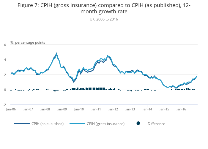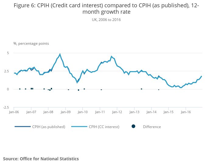 Image .csv .xlsThe maximum difference that can be observed during this period is 0.2 percentage points. Most of the differences observed are towards the beginning of the analysis (2006 to 2009) where the index was showing stronger movements and the weight is relatively larger than it is in later periods (albeit still small). Between 2010 and 2016 there are only four months where a difference between the CPIH including credit card interest and the CPIH (as published) are observed, and the difference is only 0.1 percentage points.