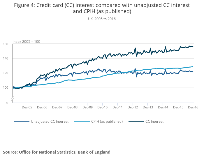 Figure 4: Credit card (CC) interest compared with unadjusted CC interest and CPIH (as published)