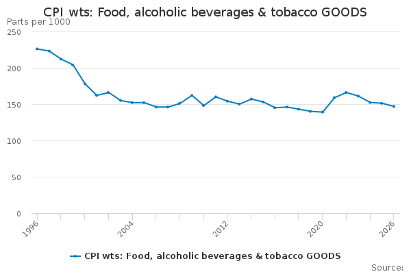 Download this time seriesCPI wts: Food, alcoholic beverages & tobacco GOODS