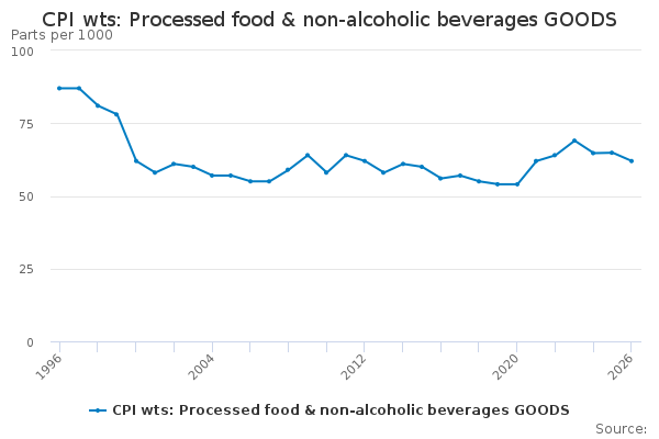Download this time seriesCPI wts: Processed food & non-alcoholic beverages GOODS